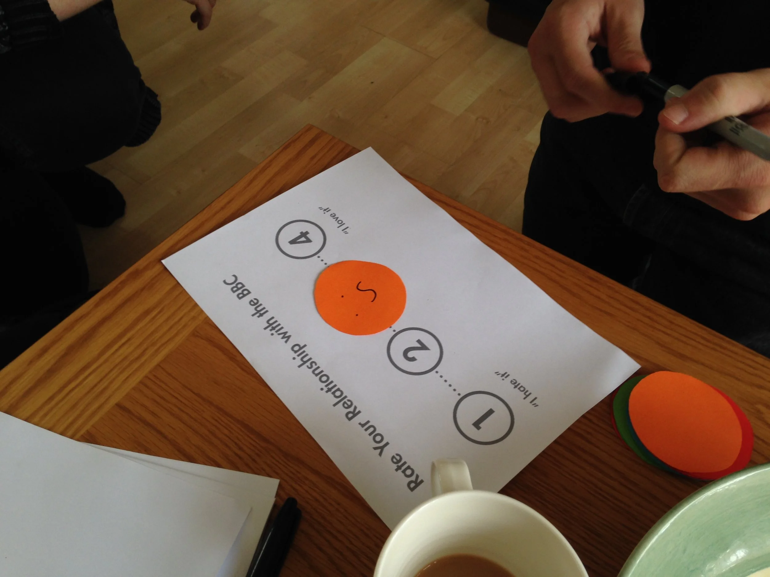 Interactive Interview Exercise: A relationship scale to make interviews more interactive. Interviewees rate their relationship with BBC by placing a circle on a scale from 1 (hate it) to 4 (love it).